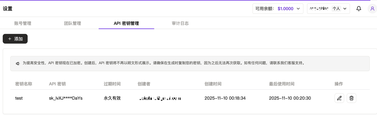 Open the [API Key] management page, click the Add button, enter a custom key name, and generate an API key.