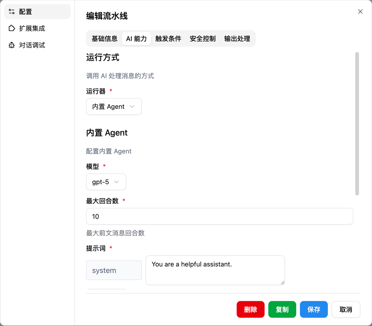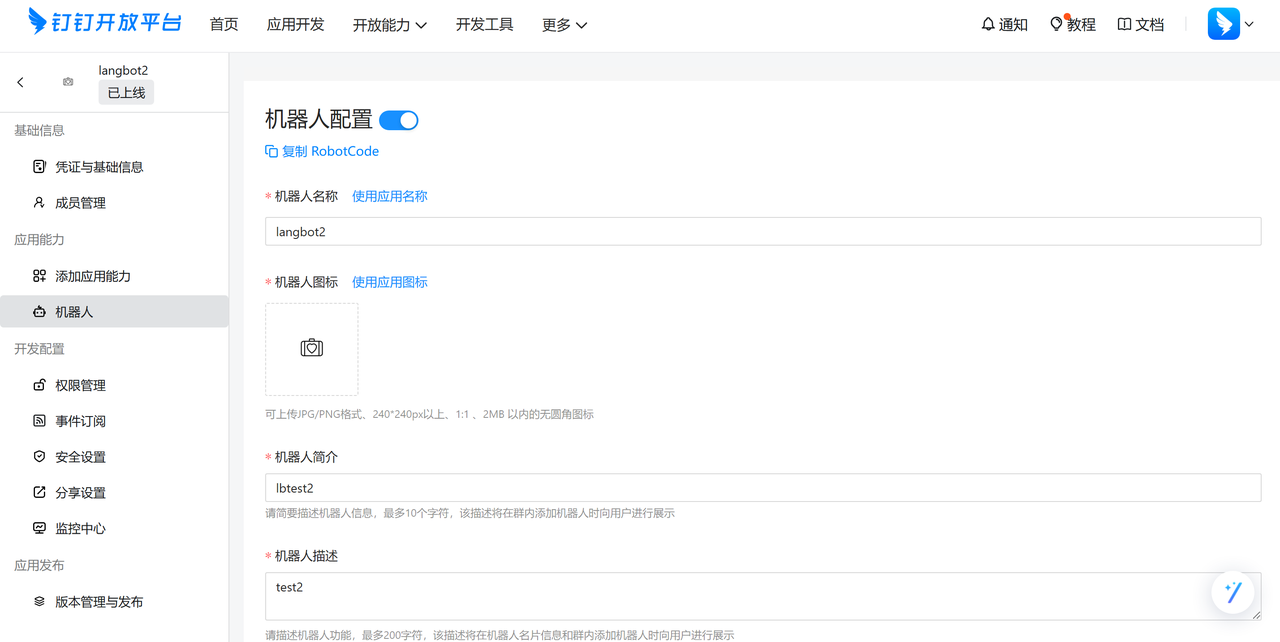 Select [Add App Capability] to add bot functionality to the application. Click the [Bot] tab on the left, fill in the bot configuration information, complete the name, description, message name, and other basic settings. Once configured, click Publish.