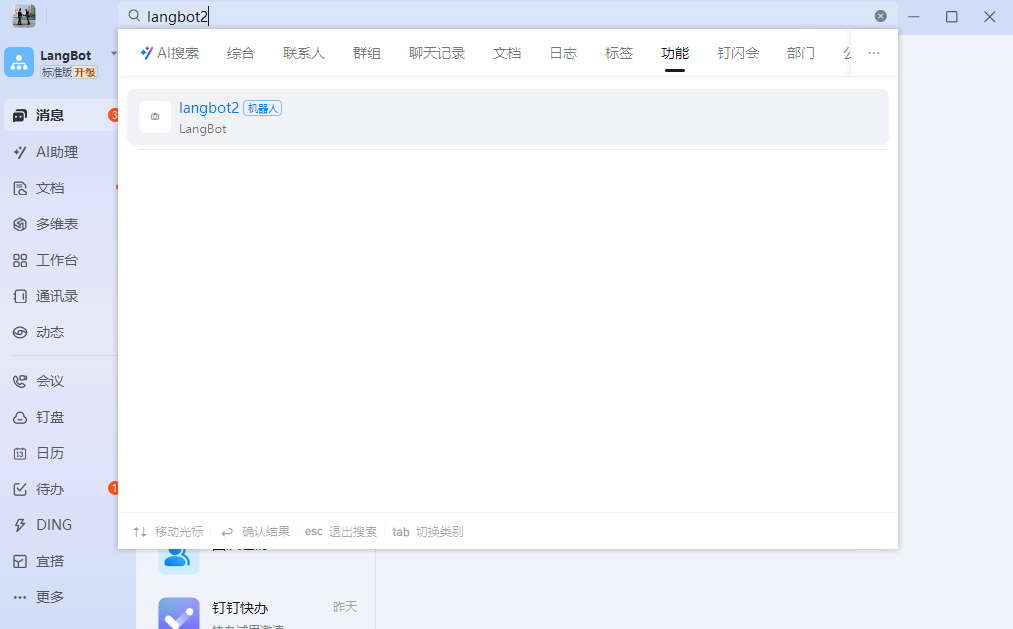 Search for the bot name you just configured in DingTalk and click on it to start chatting.